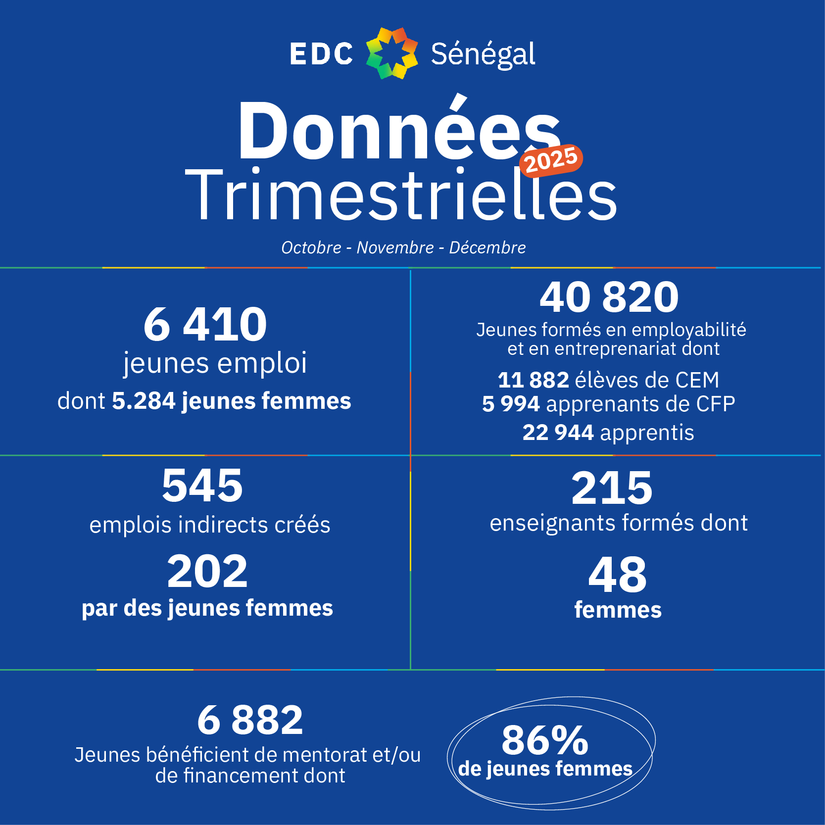 Les Données Trimestrielles (octobre – novembre – décembre 2025) constituent un outil d’information et de référence destiné aux partenaires, aux institutions, aux bénéficiaires et à toute partie prenante souhaitant disposer d’une vision claire et actualisée des performances et réalisations de EDC SENEGAL.